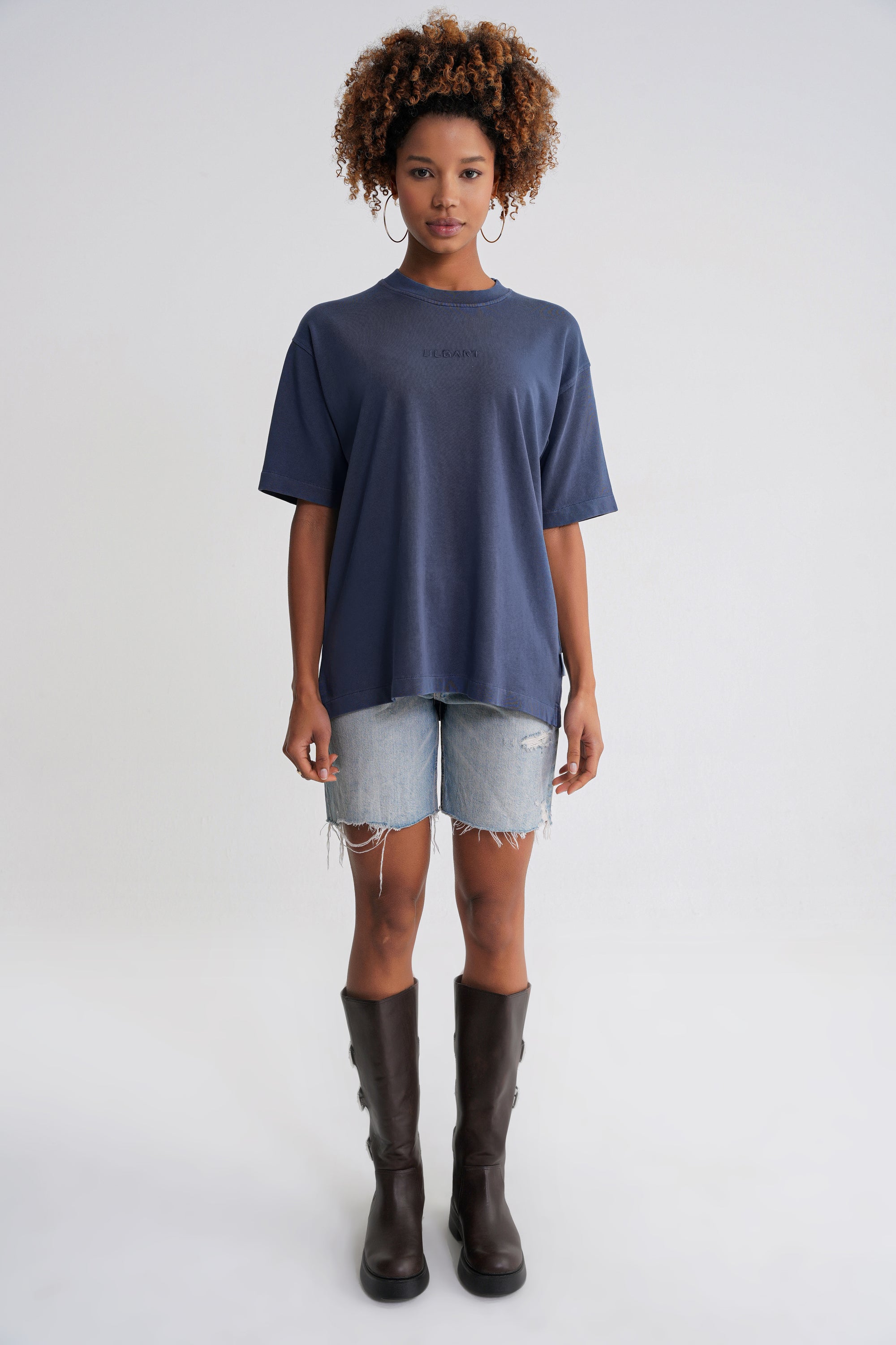 Dieses Modell ist ein leichtes, modern geschnittenes T-Shirt mit niedrig angesetzter Schulterlinie und einer Passform zwischen Oversized und Grooved Fit.